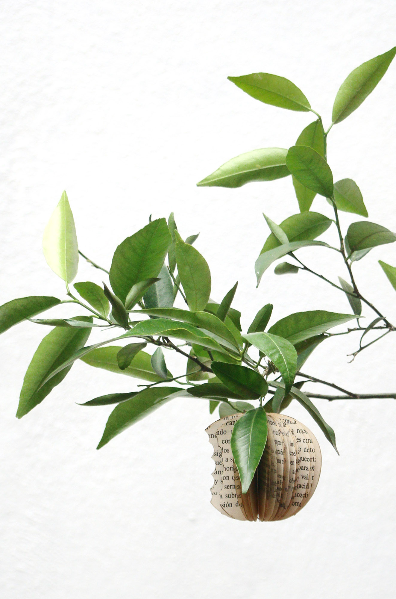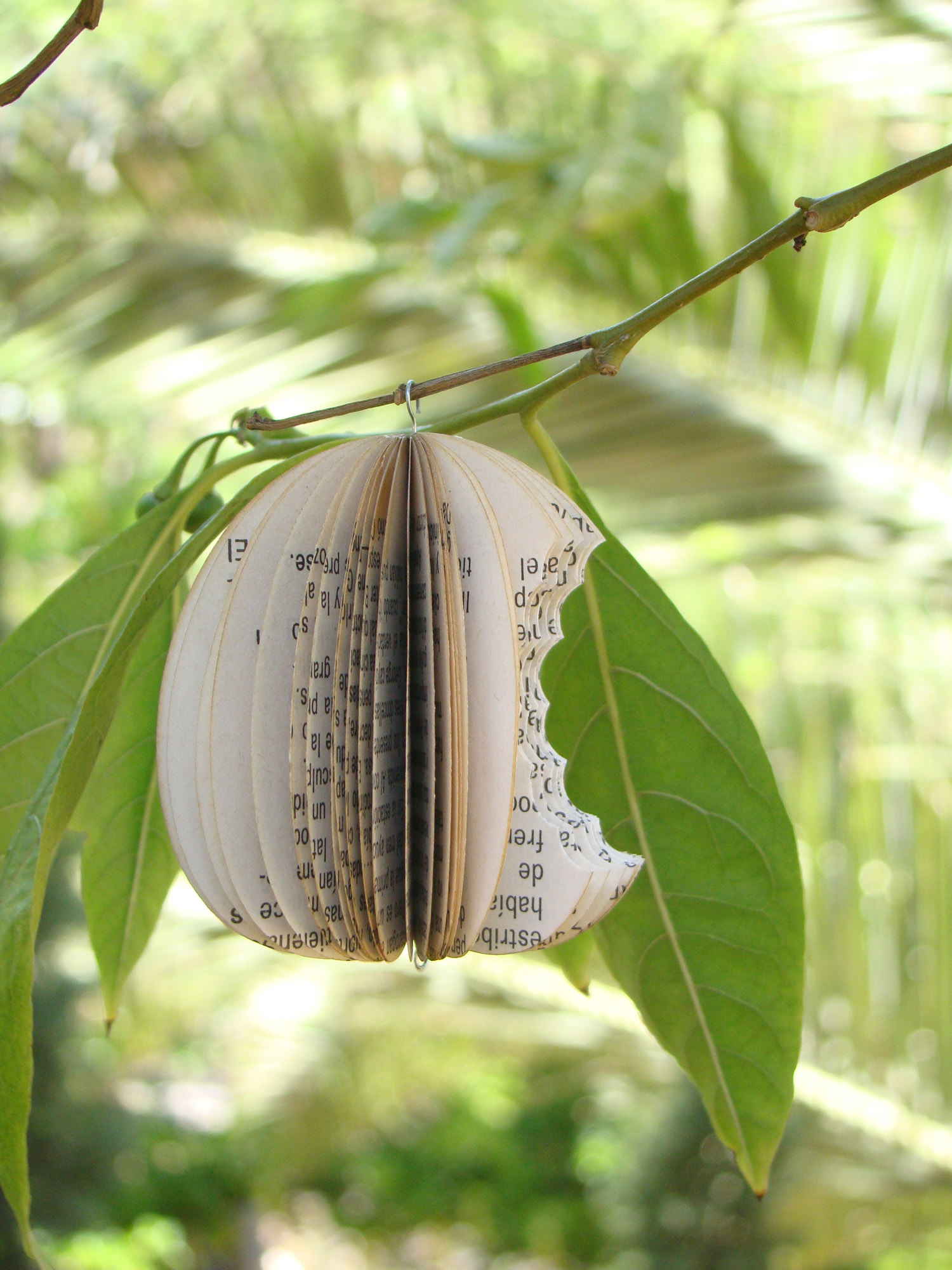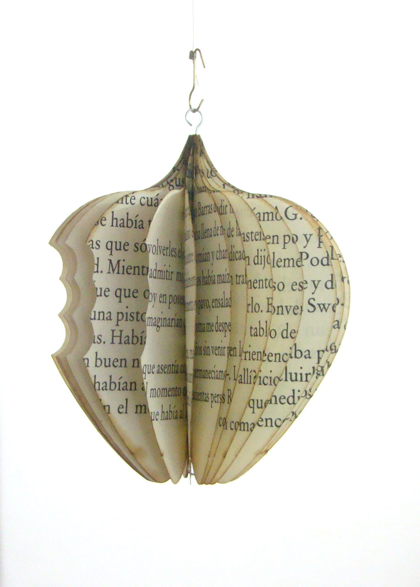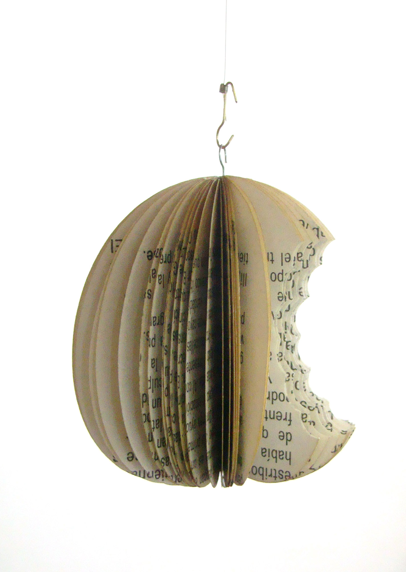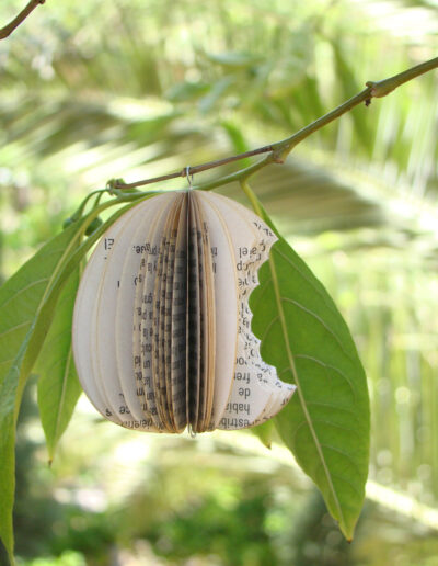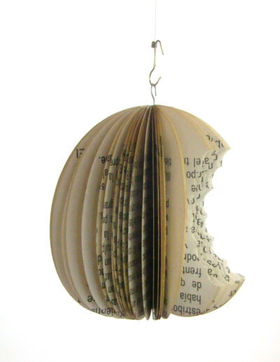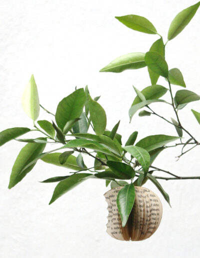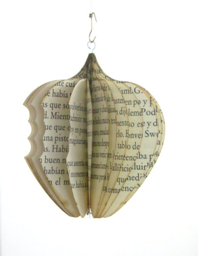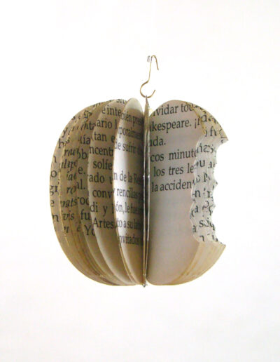 Semillas de libro: Fruto prohibido Fruto prohibido (2012), escultura de recorte de hojas de libro impreso reensamblado, 8 x 8 x 8 cm