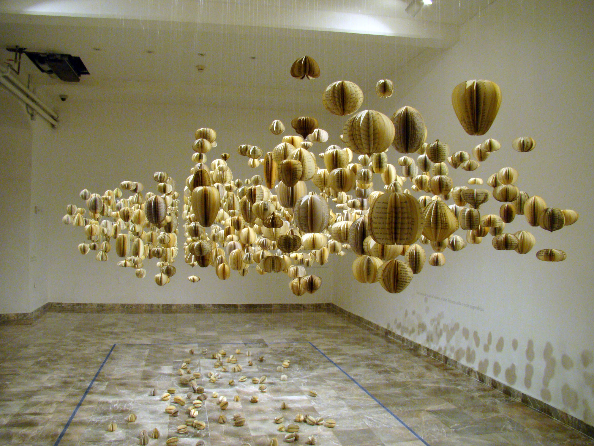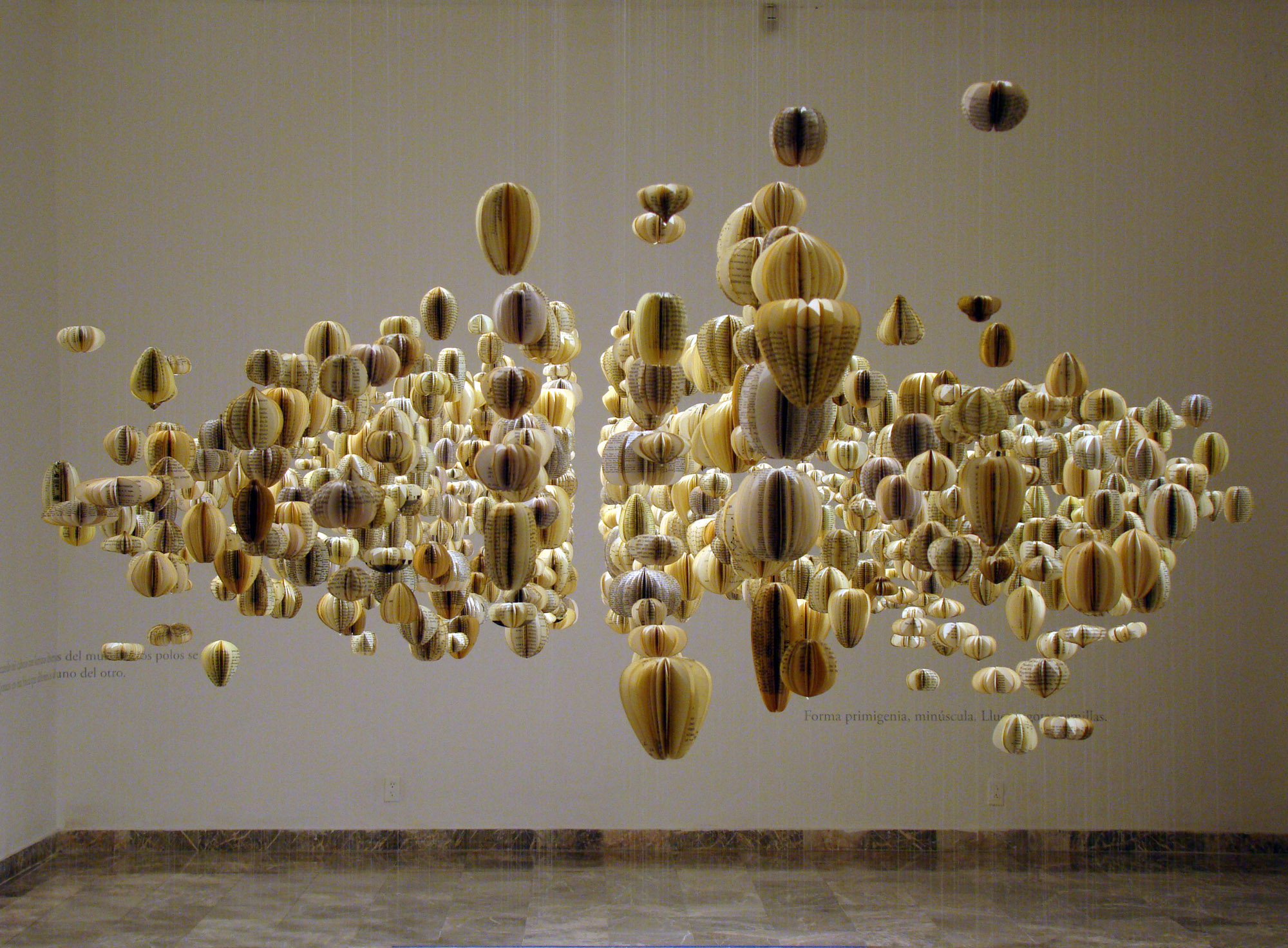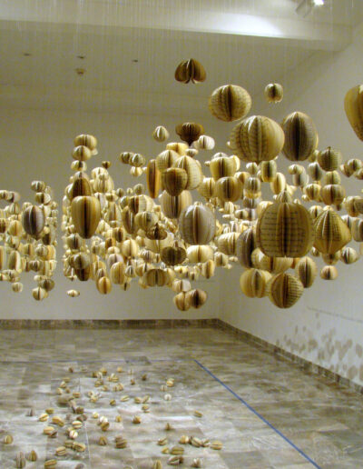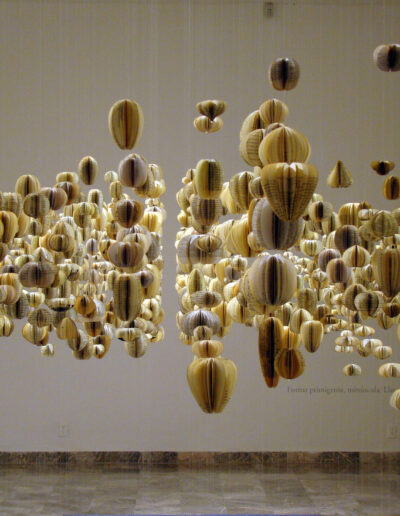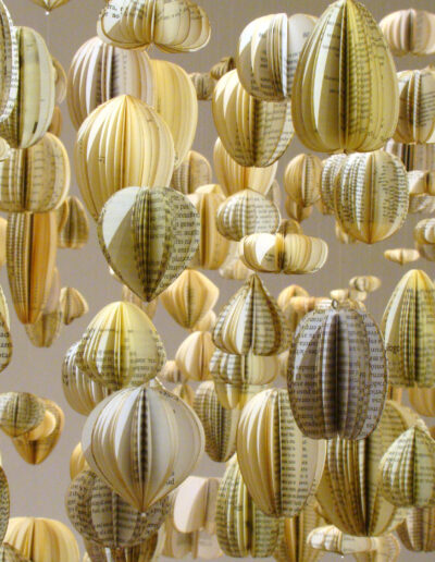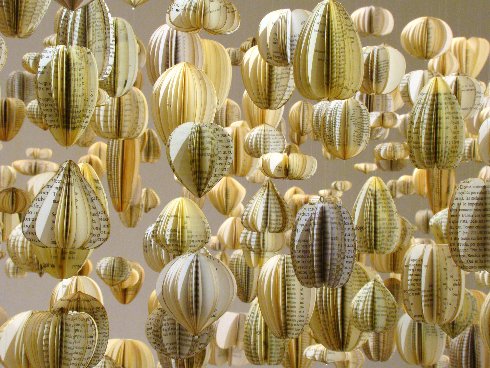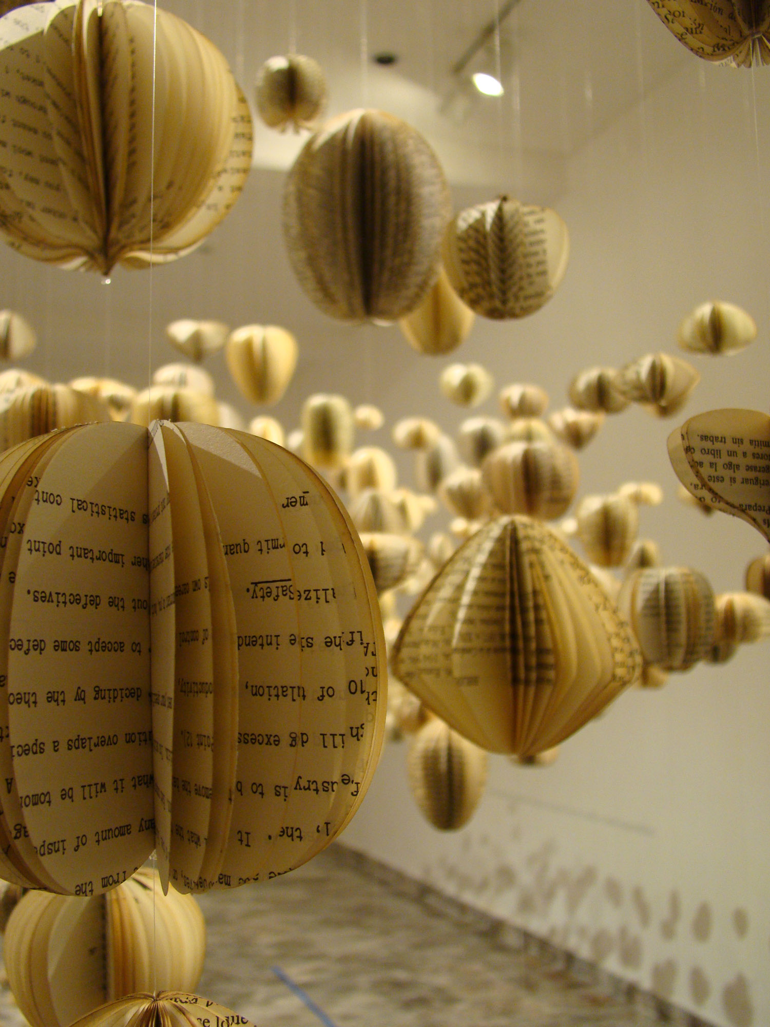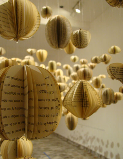 Instalación de recorte de hojas de libros impresos reensamblados.